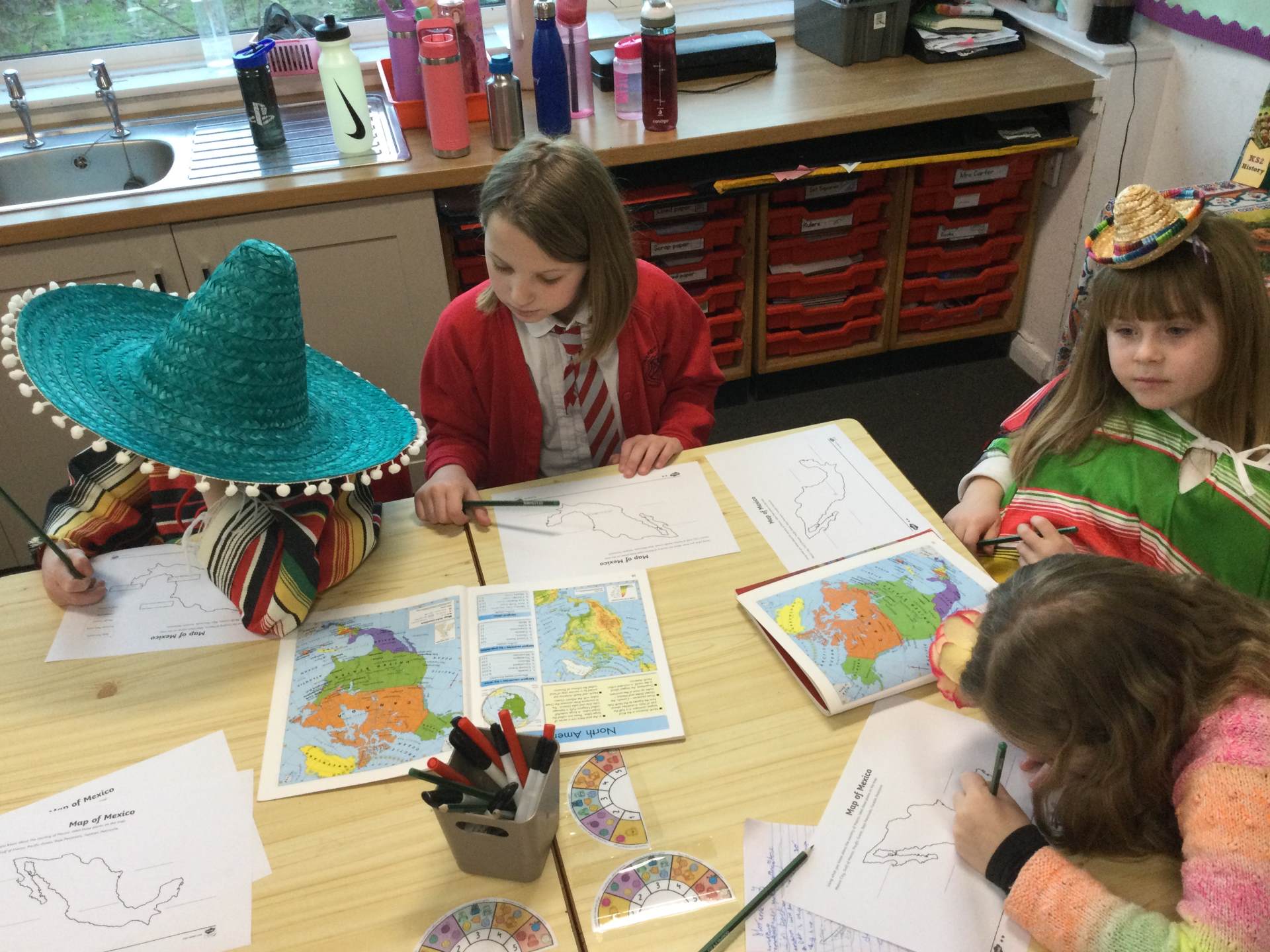 We started by using atlases to find Mexico, look at the countries and bodies of water around it. These were then plotted on a map along with Chitchen Itza, one of the more famous Mayan temples.